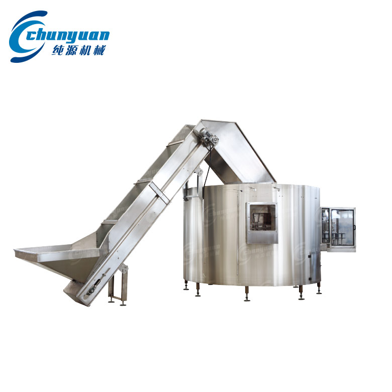 全自動(dòng)理瓶機(jī)由儲(chǔ)瓶倉或人工輔助輸入,經(jīng)皮帶提升至理瓶機(jī)筒內(nèi),通過固定的錐形底部的不斷滑動(dòng),瓶子沿旋轉(zhuǎn)筒切線向排列。沿旋轉(zhuǎn)筒切線向安裝有提瓶裝置,通過安裝在設(shè)備內(nèi)部的凸輪系統(tǒng)控制其運(yùn)動(dòng)。它圍繞著垂直曲線來轉(zhuǎn)動(dòng),由放置在機(jī)器內(nèi)部的馬達(dá)驅(qū)動(dòng)。全自動(dòng)理瓶機(jī)把雜亂無章的塑料瓶子(PET瓶)整理后,有序地按照規(guī)定的方向排列輸送到?jīng)_瓶機(jī)或者灌裝機(jī)械,從而降低了工人的勞動(dòng)強(qiáng)度,提高了灌裝機(jī)械的效率,同時(shí)也可以避免因人手接觸而造成的二次污染。