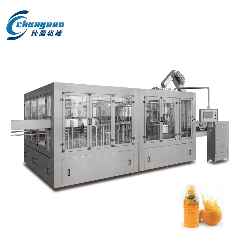 純?cè)礄C(jī)械廠(chǎng)家供應(yīng)的果蔬汁飲料機(jī)械集洗瓶、灌裝、封蓋于一體,適用于各種果汁、茶飲料的灌裝。